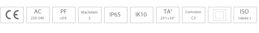 LED driver forventet levetid 100.000 timer. Armaturets certificering er under CIE EN 60598 1-2 og herunder EN550 15/EMC.