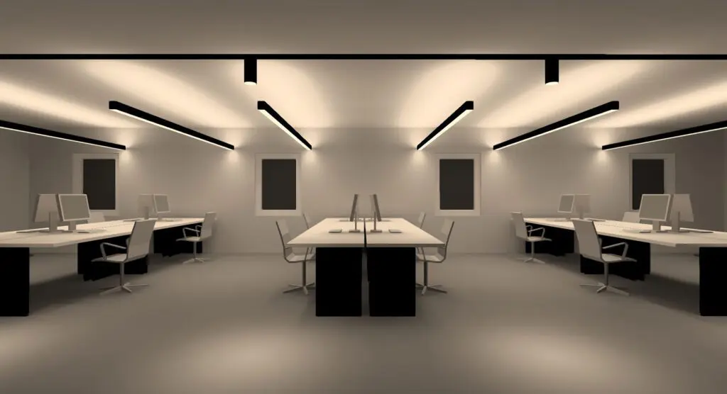 Dialux Visualisierung - Linienprofile als Grundbeleuchtung: Lineare Profile bieten ein stromlinienförmiges und stilvolles Aussehen, das sich perfekt für Büros mit einer minimalistischen Inneneinrichtung eignet. Sie sorgen für eine gleichmäßige Lichtverteilung und lassen sich nahtlos in die Architektur des Raums integrieren. Um einen aufregenderen Look zu schaffen, ist es eine gute Idee, einige Strahler in Fluren oder entlang von Wänden anzubringen.