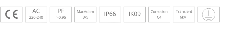 LED driver forventet levetid 50.000timer. Armaturet certificering er under CIE EN 60598 1-2 & her under EN550 15/EMC