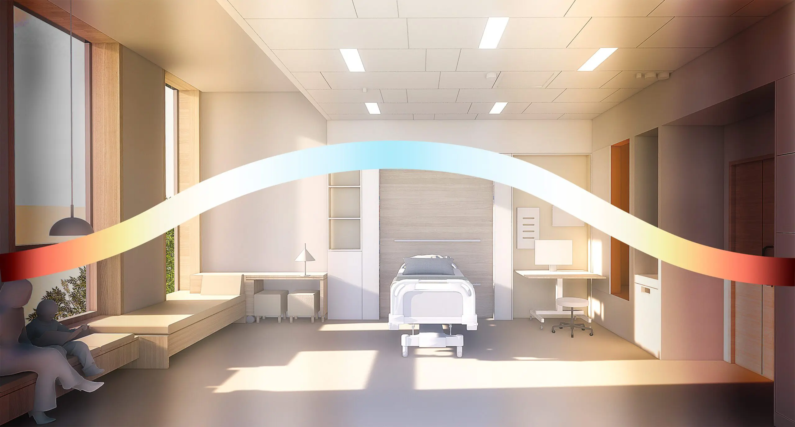 Eine Krankheit oder ein Krankenhausaufenthalt kann mit Schmerzen, Stress und Angst verbunden sein, was den Schlafrhythmus der Patienten stören kann. Zirkadiane Beleuchtung und Nachtbeleuchtung können die Hormonproduktion unterstützen, die sich auf den zirkadianen Rhythmus auswirkt und zu einem regelmäßigen und tiefen Schlaf beitragen kann. Schlaf und Ruhe sind für die Genesung und Heilung der Patienten von entscheidender Bedeutung.