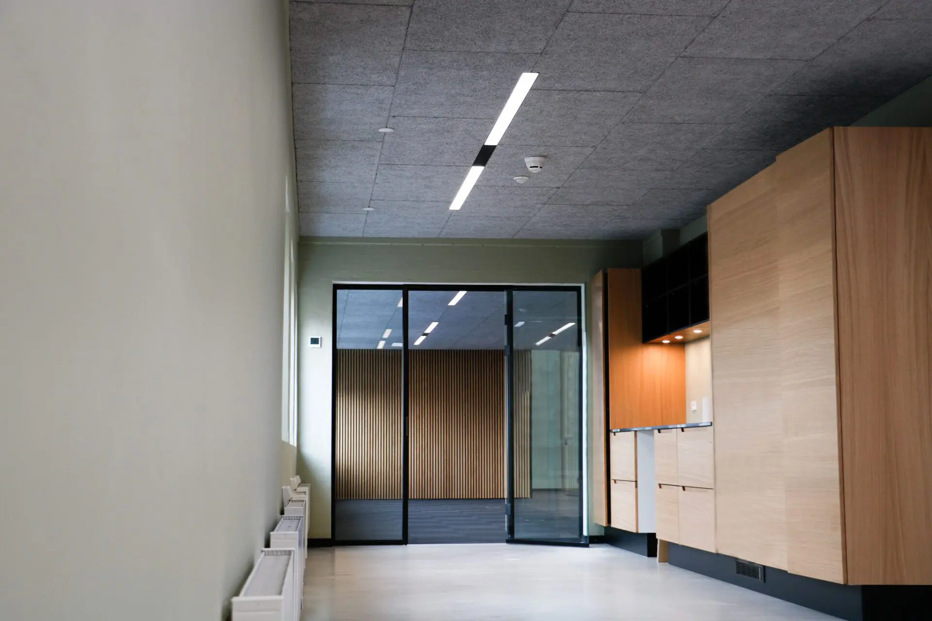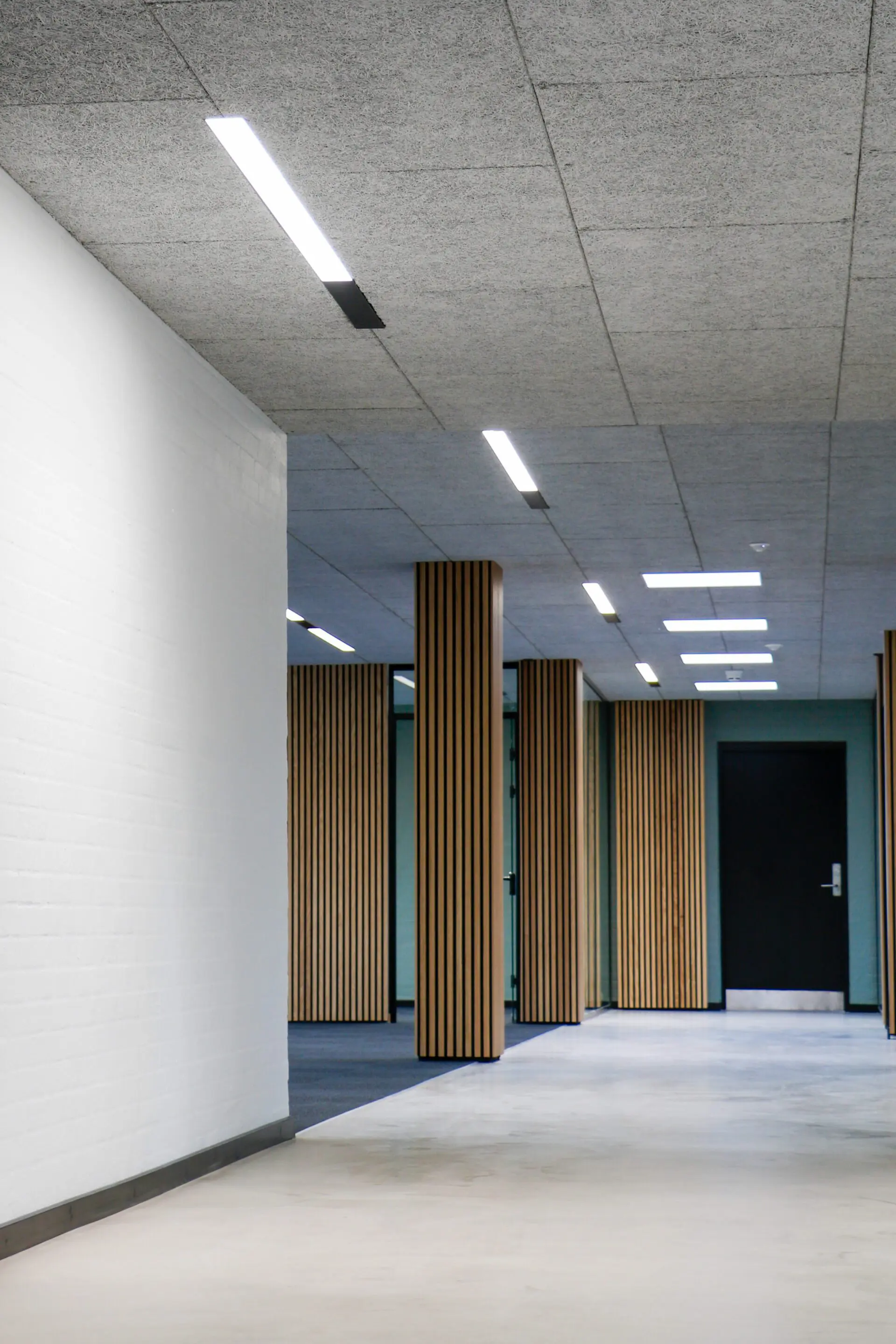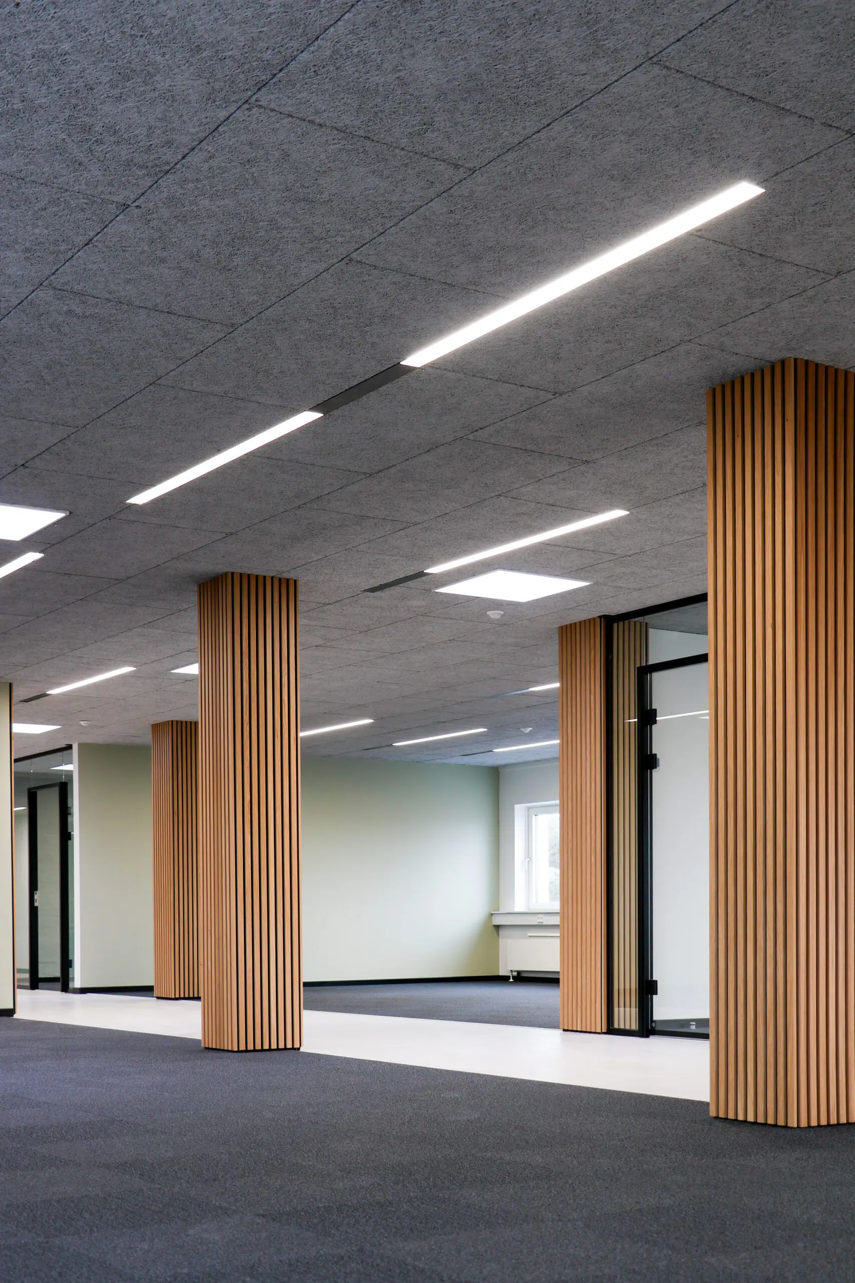 Der Wunsch nach langen Linienprofilen, die in Troldtekt-Deckenplatten eingebaut werden, und die Wiederverwendung der Deckenschalung stellten hohe Anforderungen an die Einbauhöhe des Linienprofils. Eine Einbauhöhe von nur 35 mm.