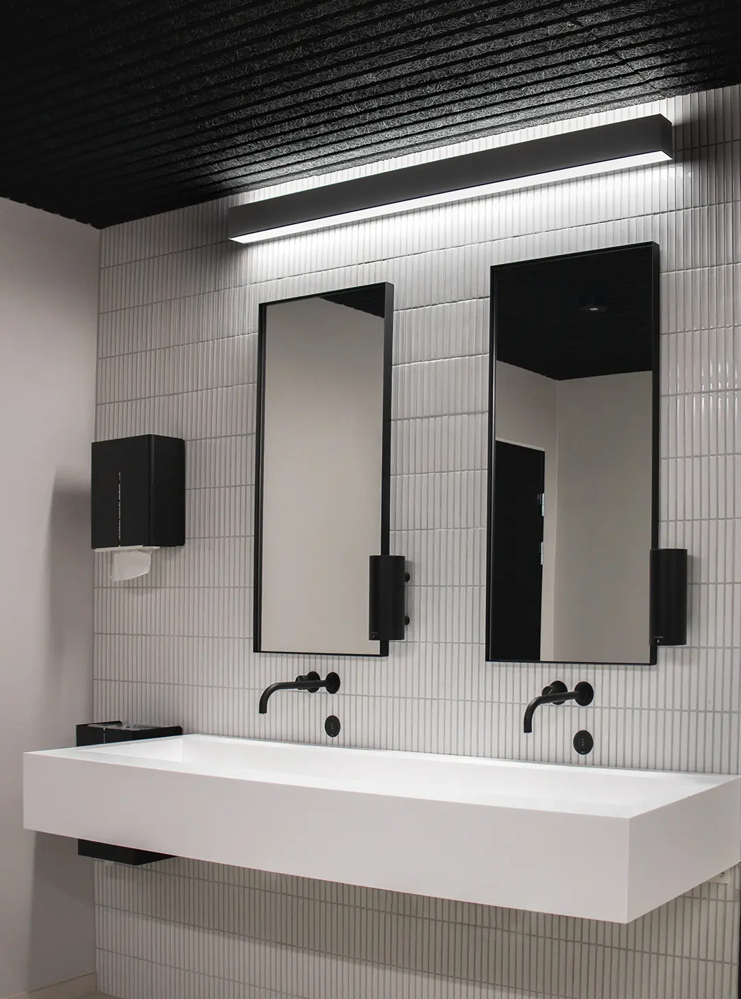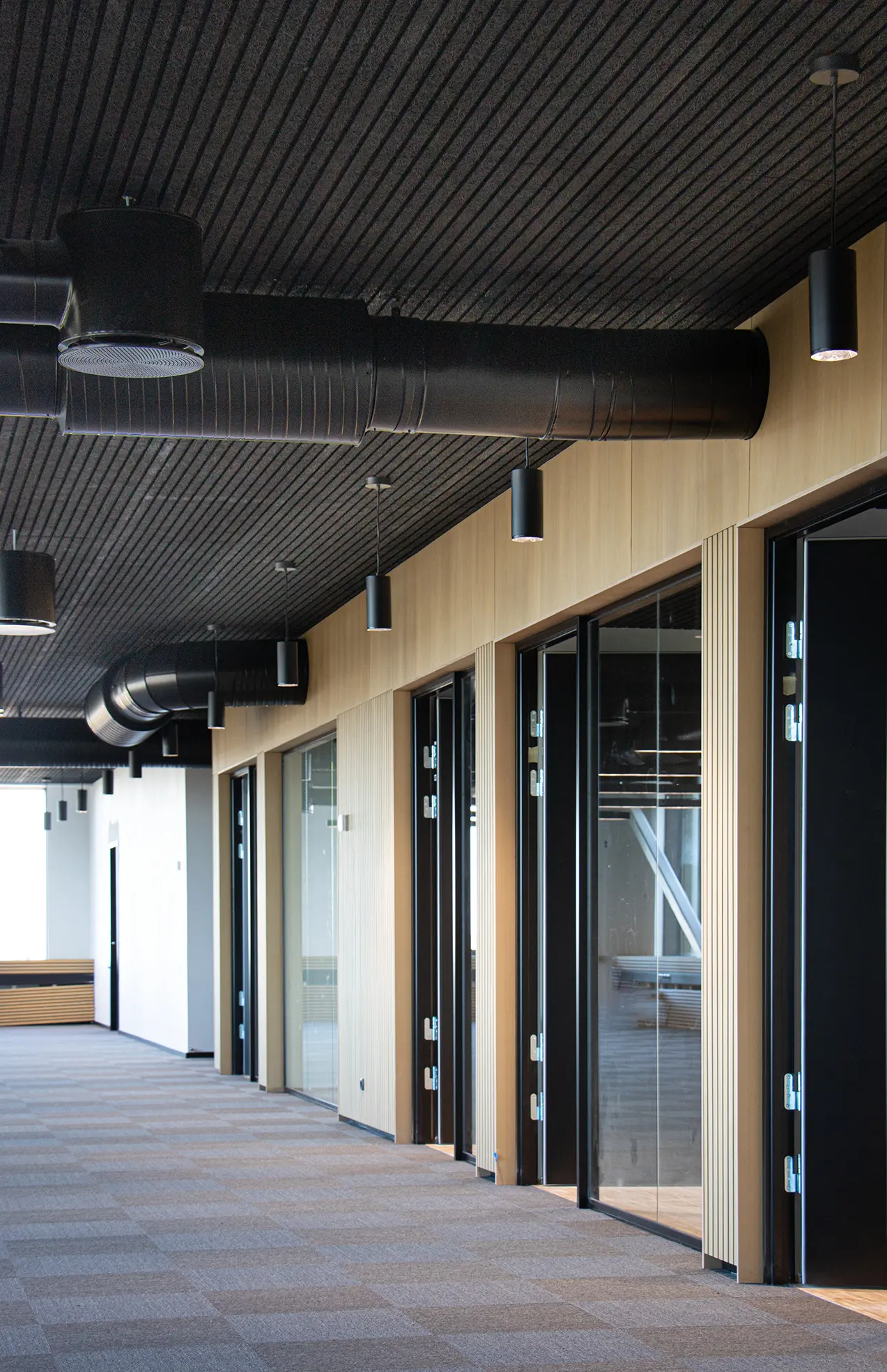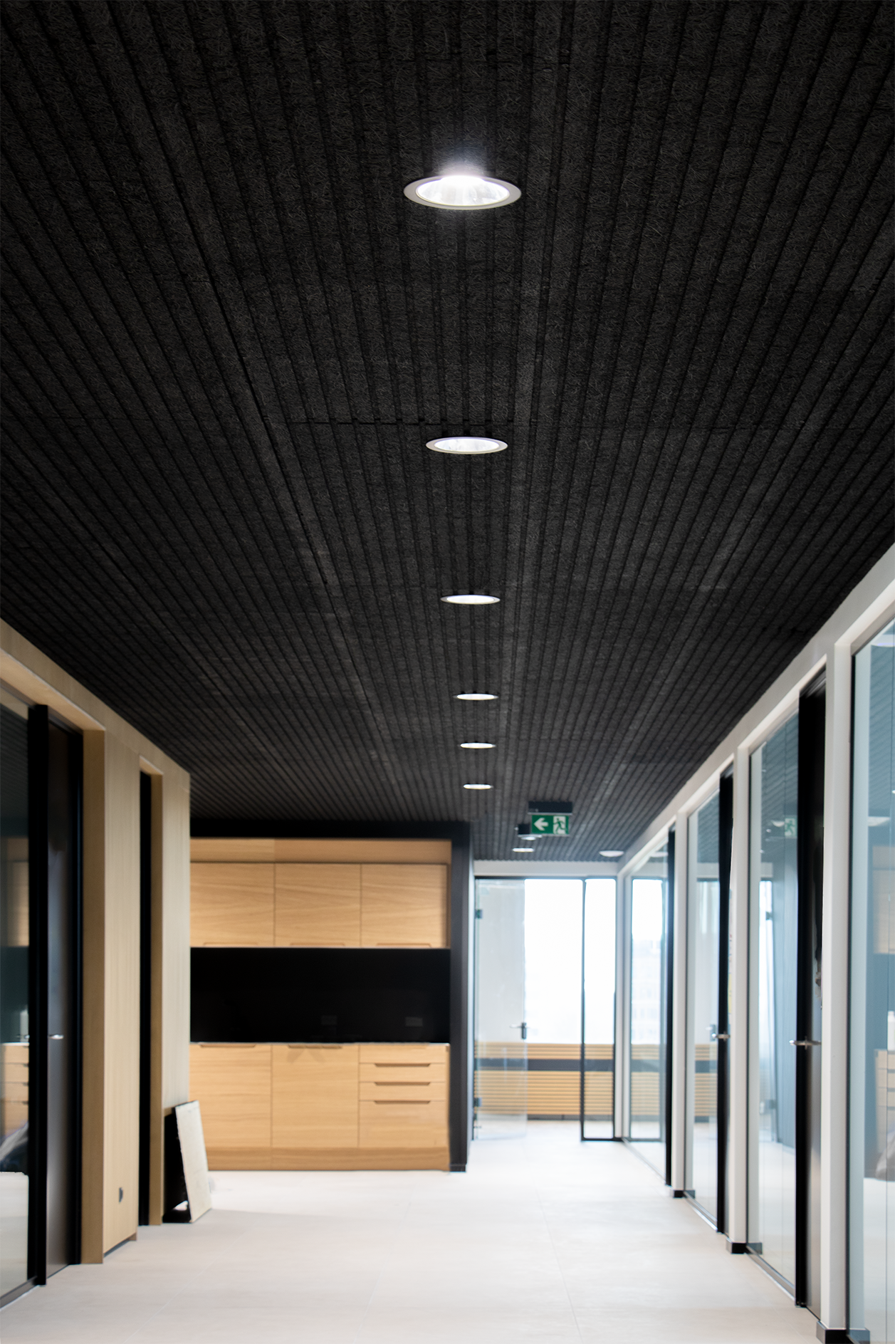 Für das Projekt lieferte Teamtronic eine stilvolle Beleuchtungslösung, bestehend aus maßgeschneiderten Z-line Linienprofilen, die sich durch alle Etagen des Gebäudes ziehen. Für die Großraumbüros und Besprechungsräume wurde die schwarze Z-line Suspended 53.8-80 in 3000 mm gewählt, die eine vielseitige und optimale Grundbeleuchtung für die Büroumgebung bietet. Für die Treppenhäuser des Bürokomplexes wurden schwarze Z-line On 53.8-80 in 3000 mm und schwarze Z-line Wall 53.8-90 mit direktem und indirektem Licht in allen Toiletten gewählt. Darüber hinaus wurde eine Auswahl an schwarzen Leuchten wie T-C1 Long, T-Prins und T-Thebe für das Bürodomizil sowie T-Tornado G2 für das 7-stöckige Parkhaus eingesetzt.