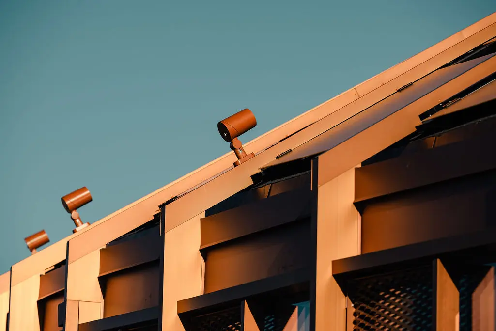Udvendigt er løsningen tilpasset bygningens markante linjer. Spots på taget er indfarvet, så de integreres diskret i konstruktionen og understreger arkitekturen uden at dominere den. Pullerter og terrænbelysning er designet i overensstemmelse med landskabet og materialeholdning. Det giver en helhed, hvor det udvendige lys fremhæver bygningens karakter og sikrer orientering og tryghed uden unødige visuelle forstyrrelser.