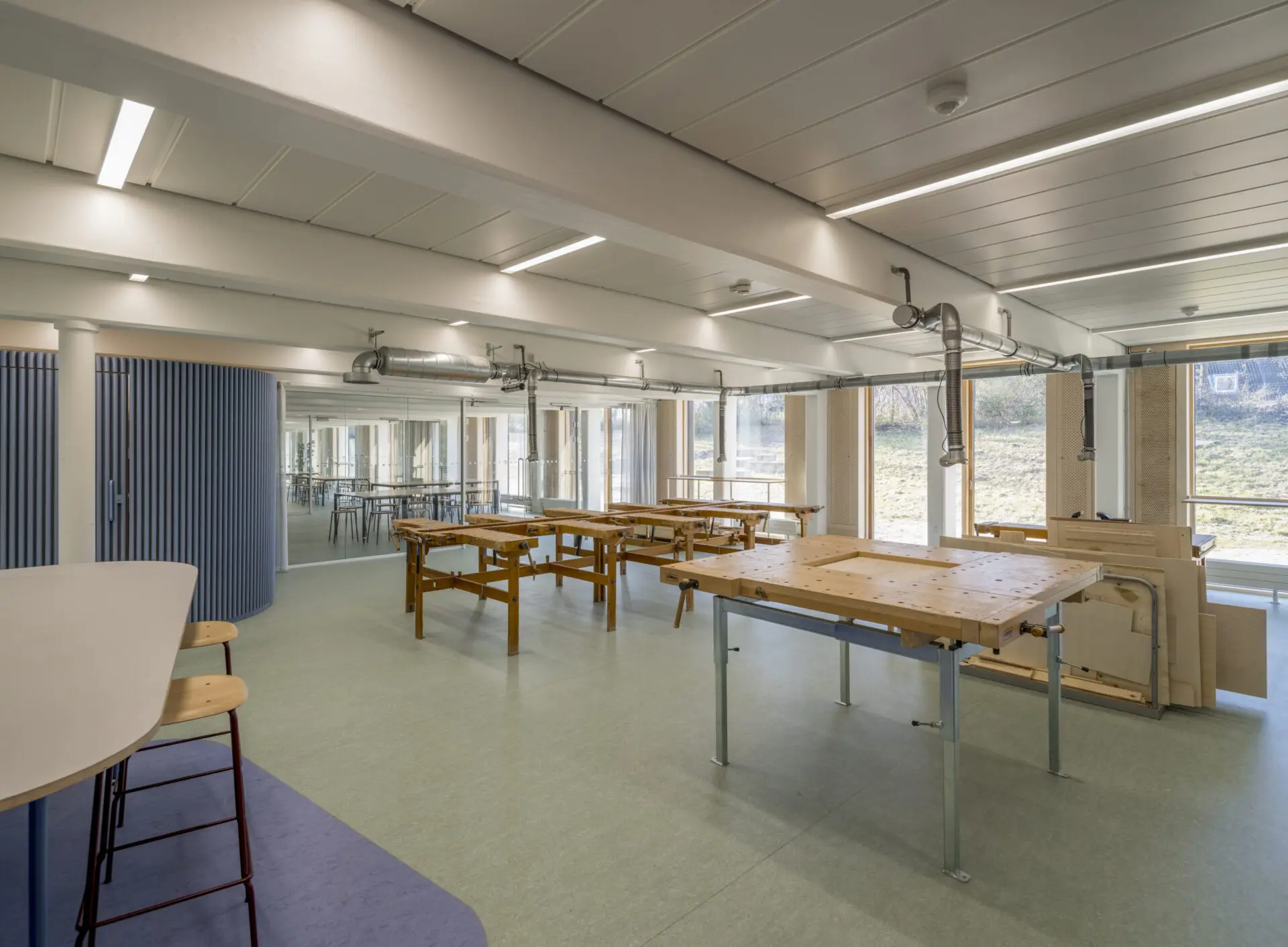 Für die Beleuchtung der Klassenzimmer haben wir unsere Linienprofile Z-line Suspended 75-78 und Z-line On 75-35 geliefert, die beide die gleiche Lichtöffnung haben. Die Beleuchtung in den Klassenzimmern wird auch entsprechend dem natürlichen Licht geregelt, das durch die großen Fenster in den Klassenzimmern einfällt.
