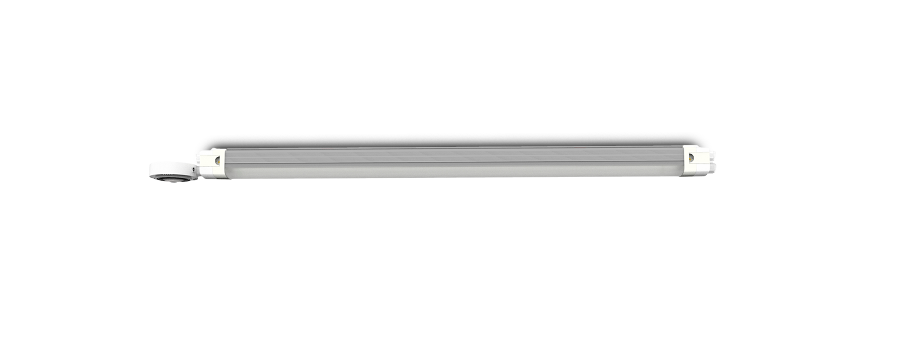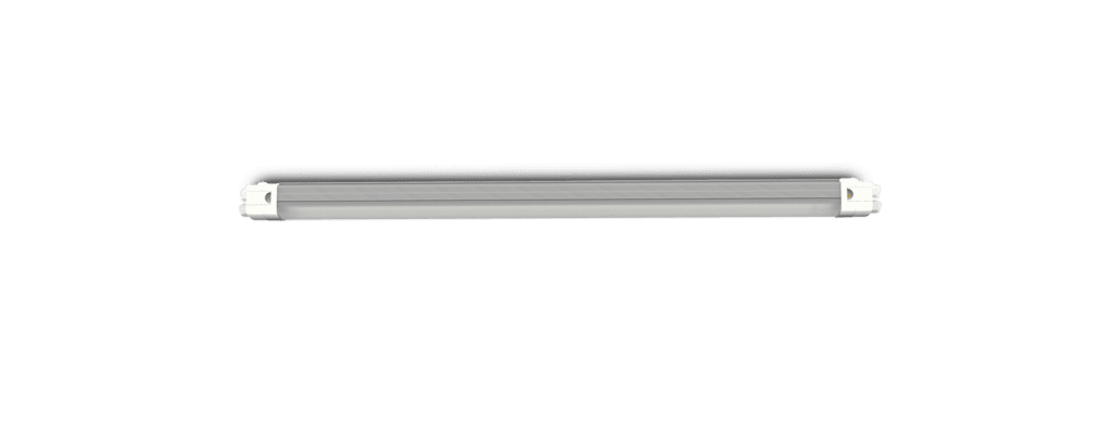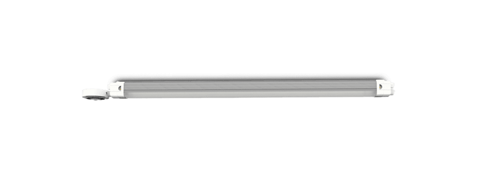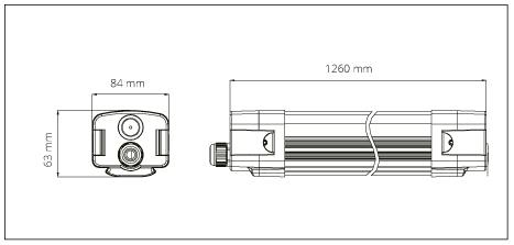 Tornado hat die Standardmaße 1260 x 84 x 63 mm, ist aus Aluminium gefertigt und wiegt 2,2 kg. Die Leuchte hat die Schutzart IP65 und ist stoßfest bis IK10. WECHSELSTROM 220-240. Standardmäßig geliefert in RAL9016