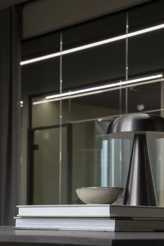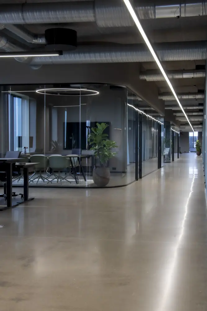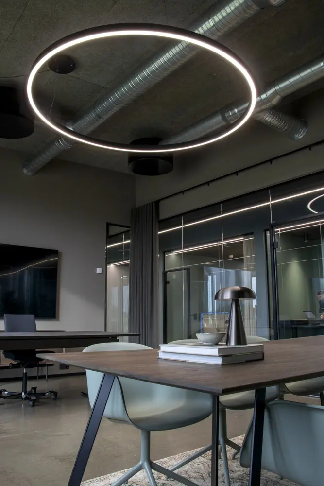 2 x 70 meter lange ubrudte linjeprofiler løber langs kontordomicilets to parallelle gangforløb. Der er her tale om en kundetilpasset belysningsløsning af vores Z-line Suspended 53.8-80 linjeprofil, hvor flere profiler er sammensat til ét langt. For at skabe en rød tråd, benyttes Z-line Suspended 53.8-80 også til grundbelysning i de åbne kontormiljøer i forskellige længder fra 3600 til 6000 mm.