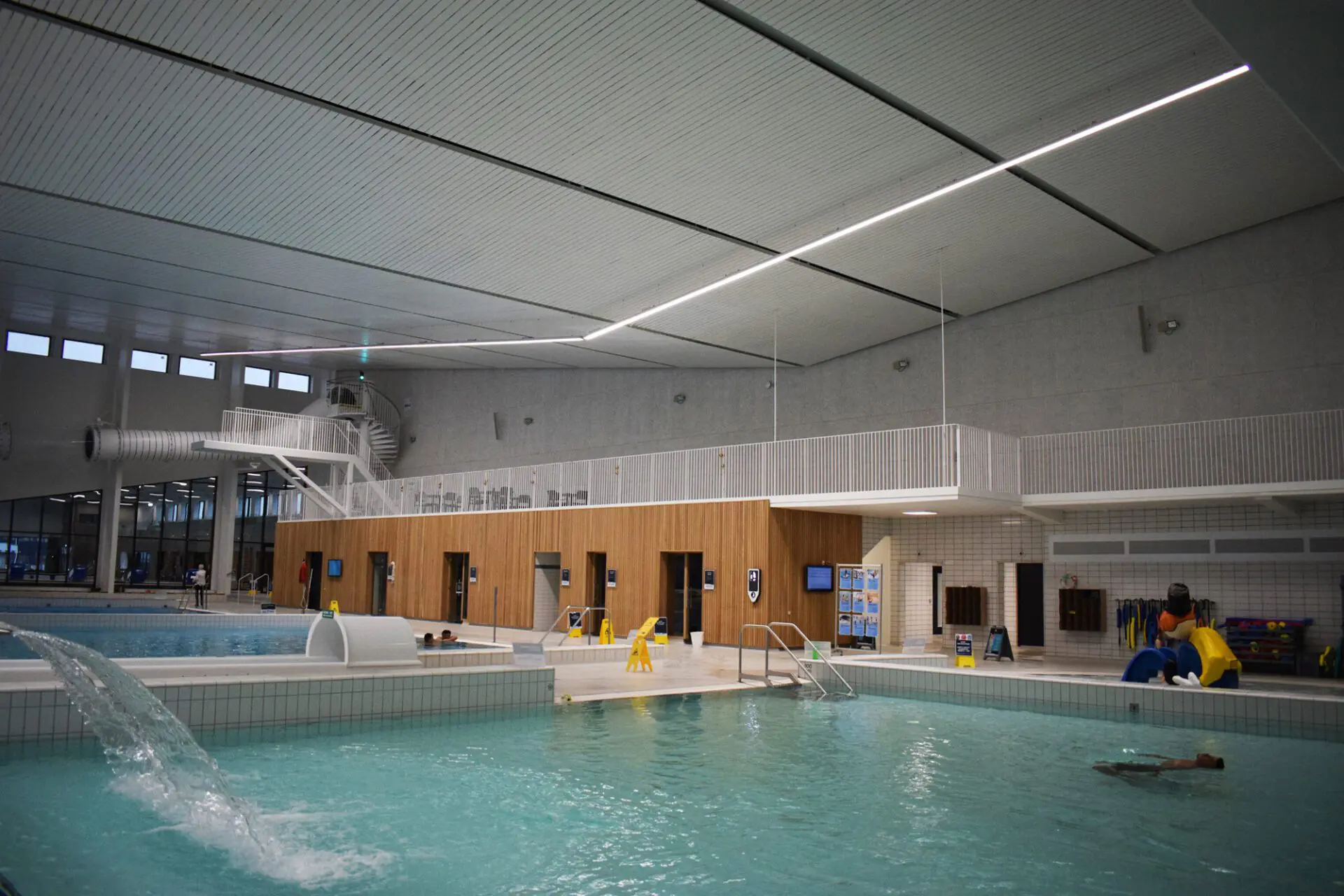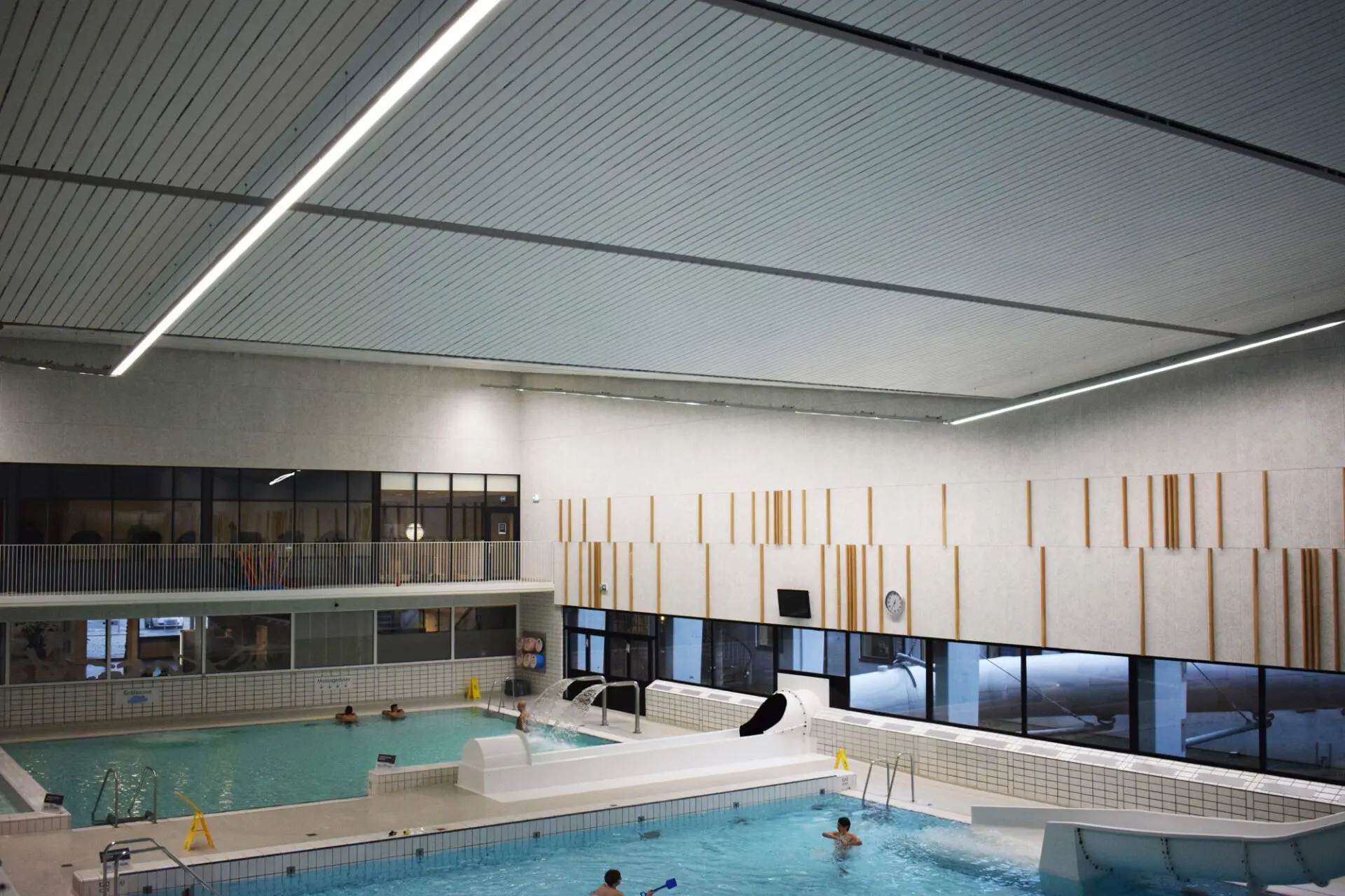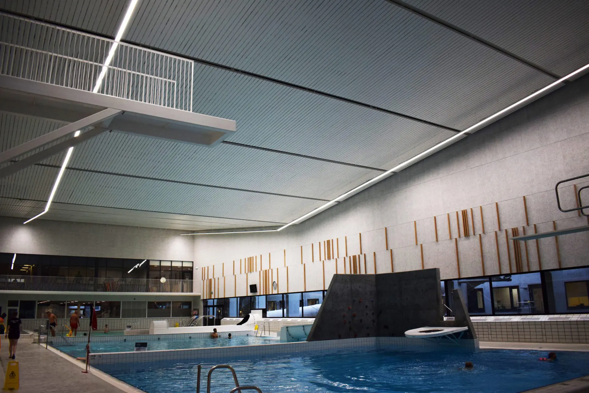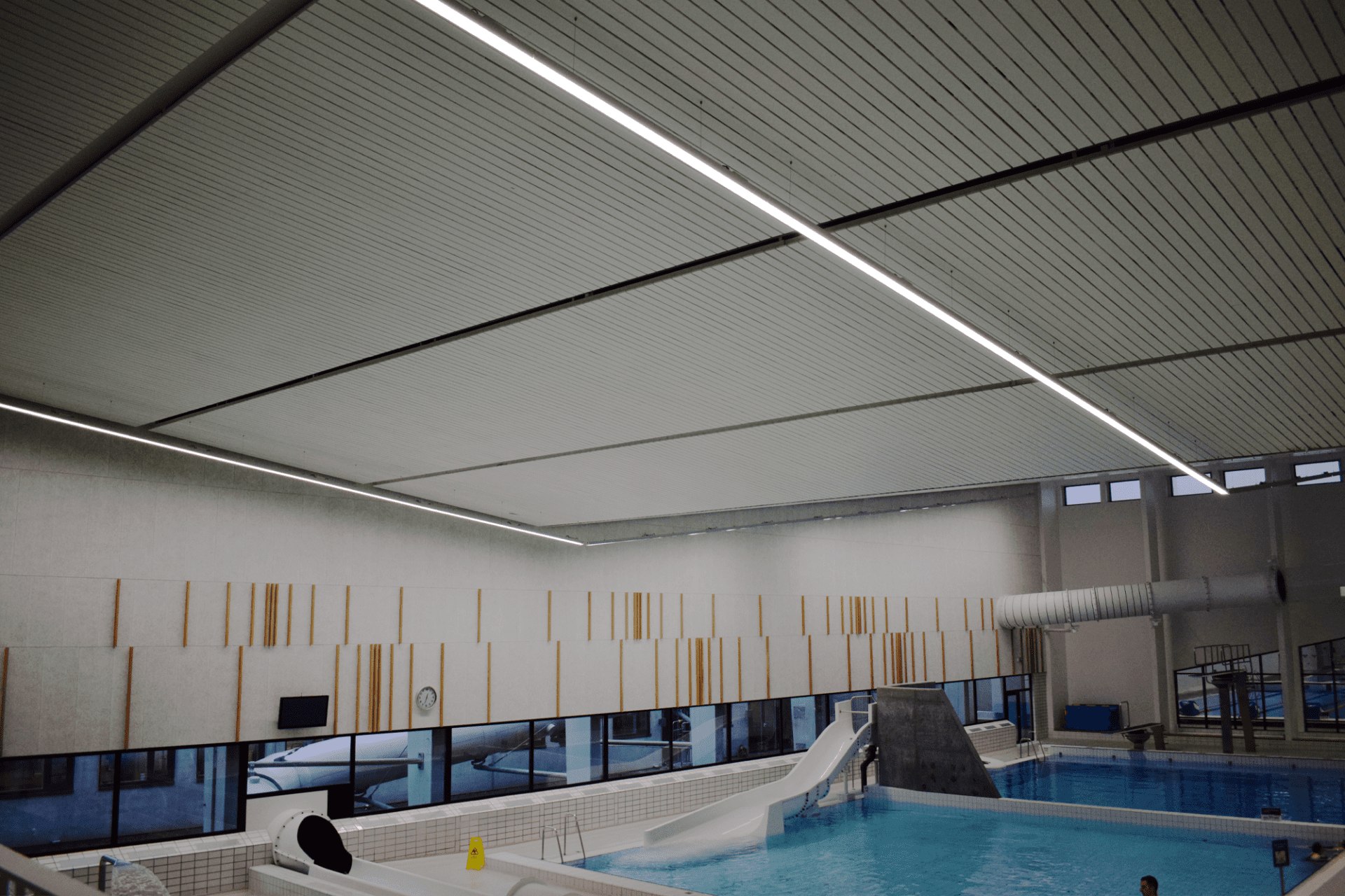 Hos Teamtronic har vi i anledningen af ombygningen leveret vores Z-line On 100-75 armaturer. De lineære armaturer er alle monteret som nedhængt. Desuden er de alle 2,4 meter lange, men er monteret, så det ligner et langt ubrudt armatur. På denne måde opnås en belysning, som følger svømmebanen fra den ene ende til den anden.