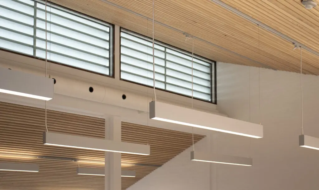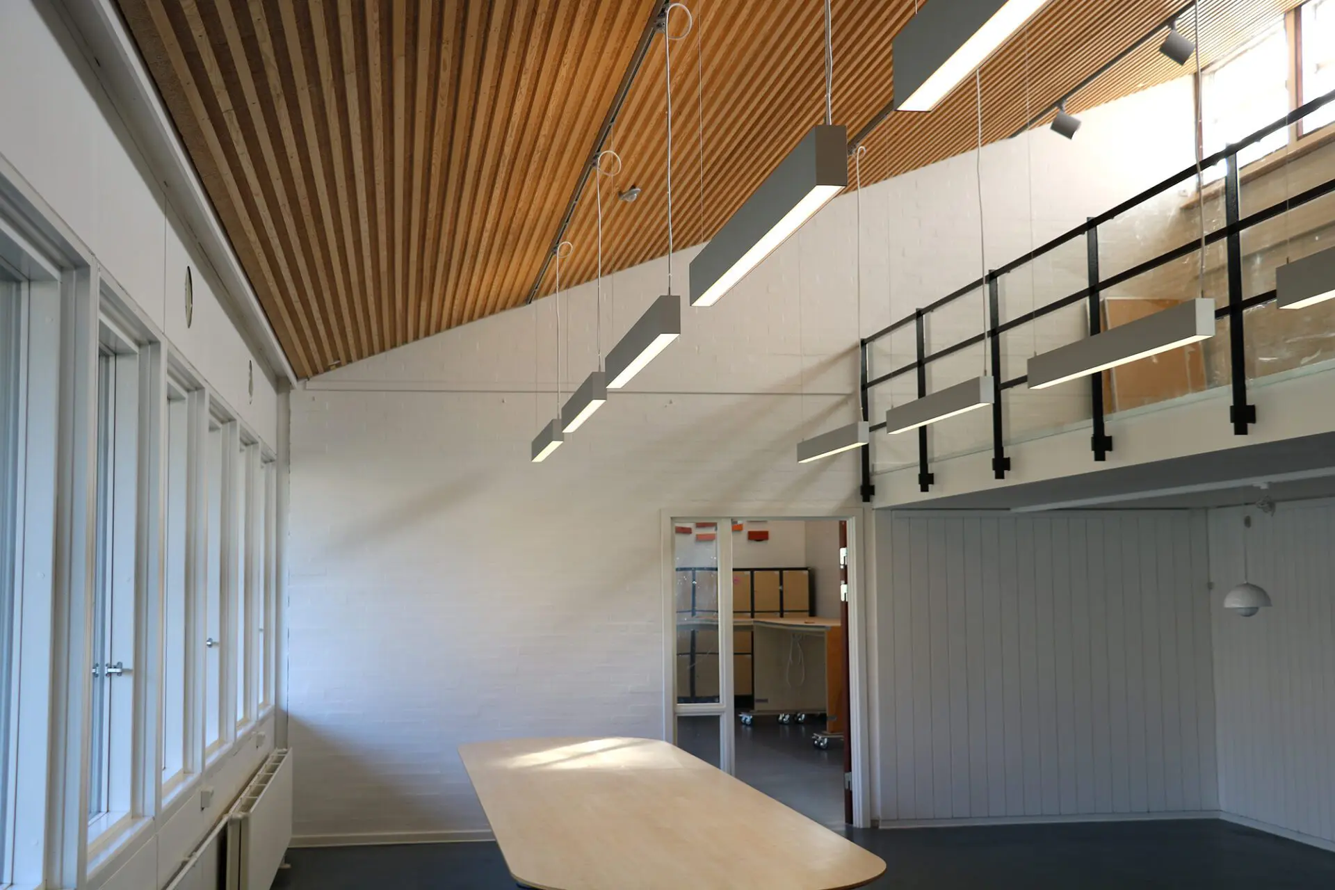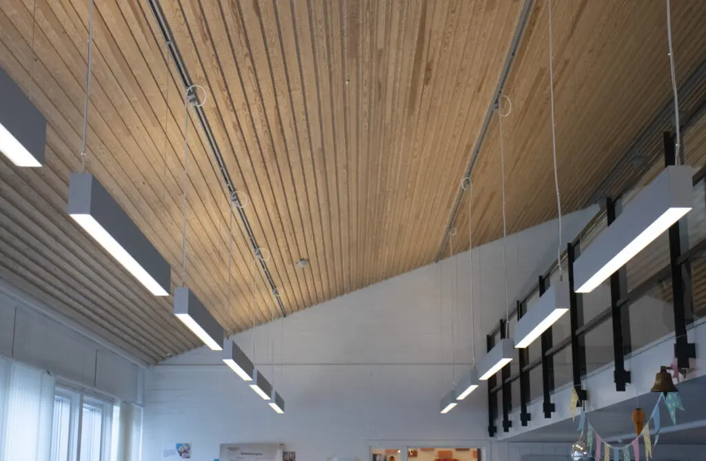 I klasse- og faglokaler blev der ydermere leveret vores Z-line Suspended 53.8-80 linjearmatur til tavlebelysning.