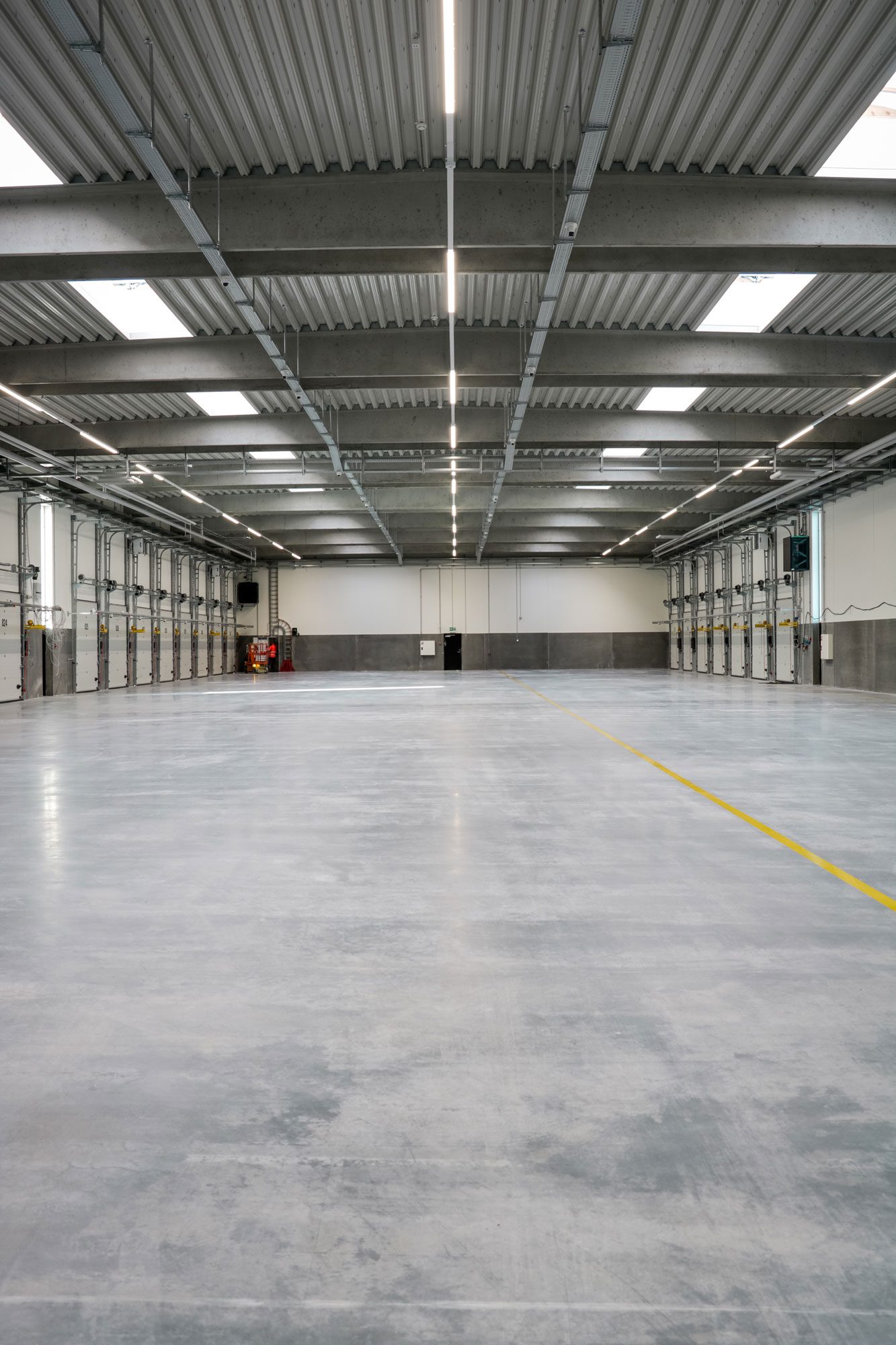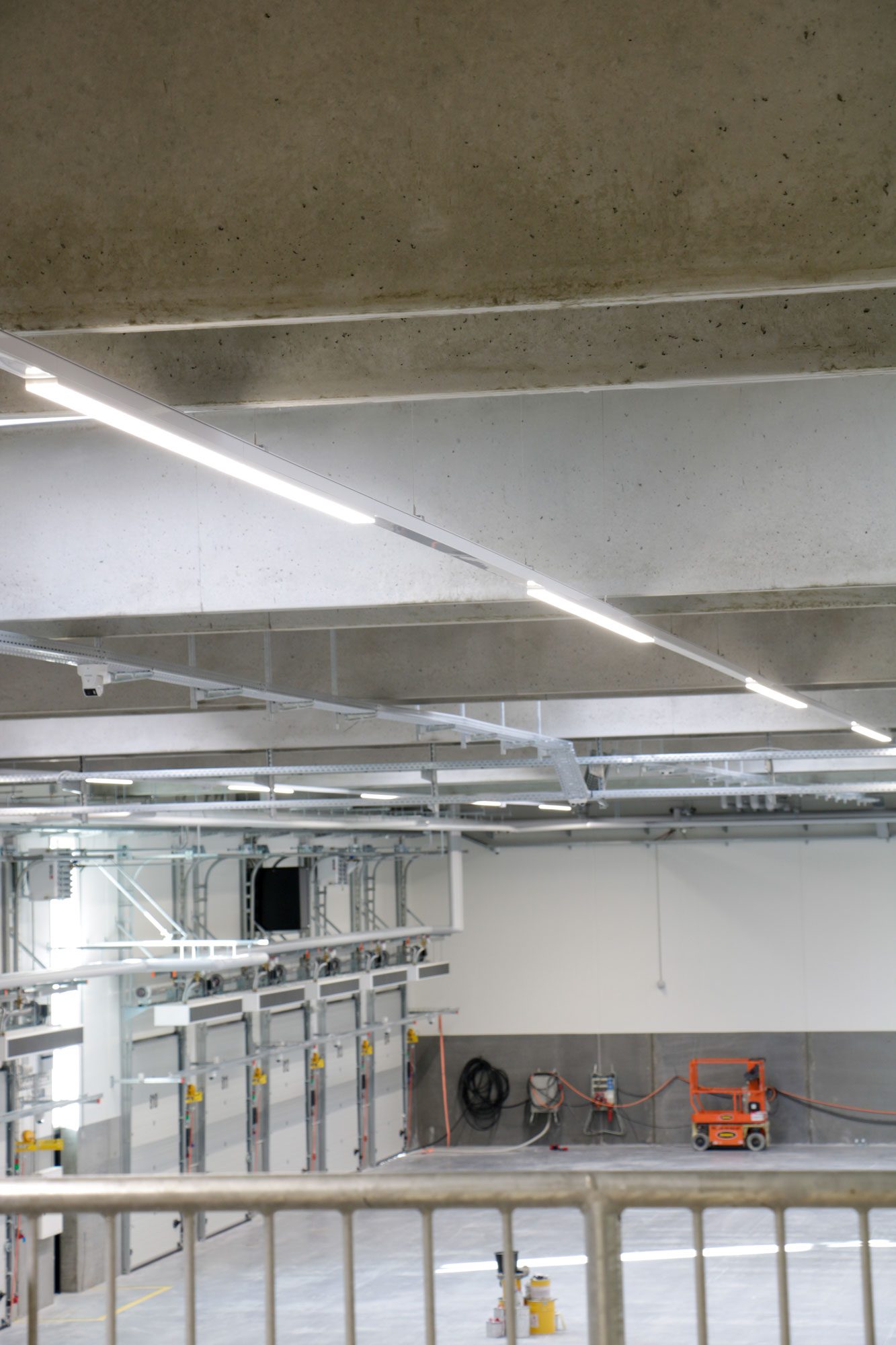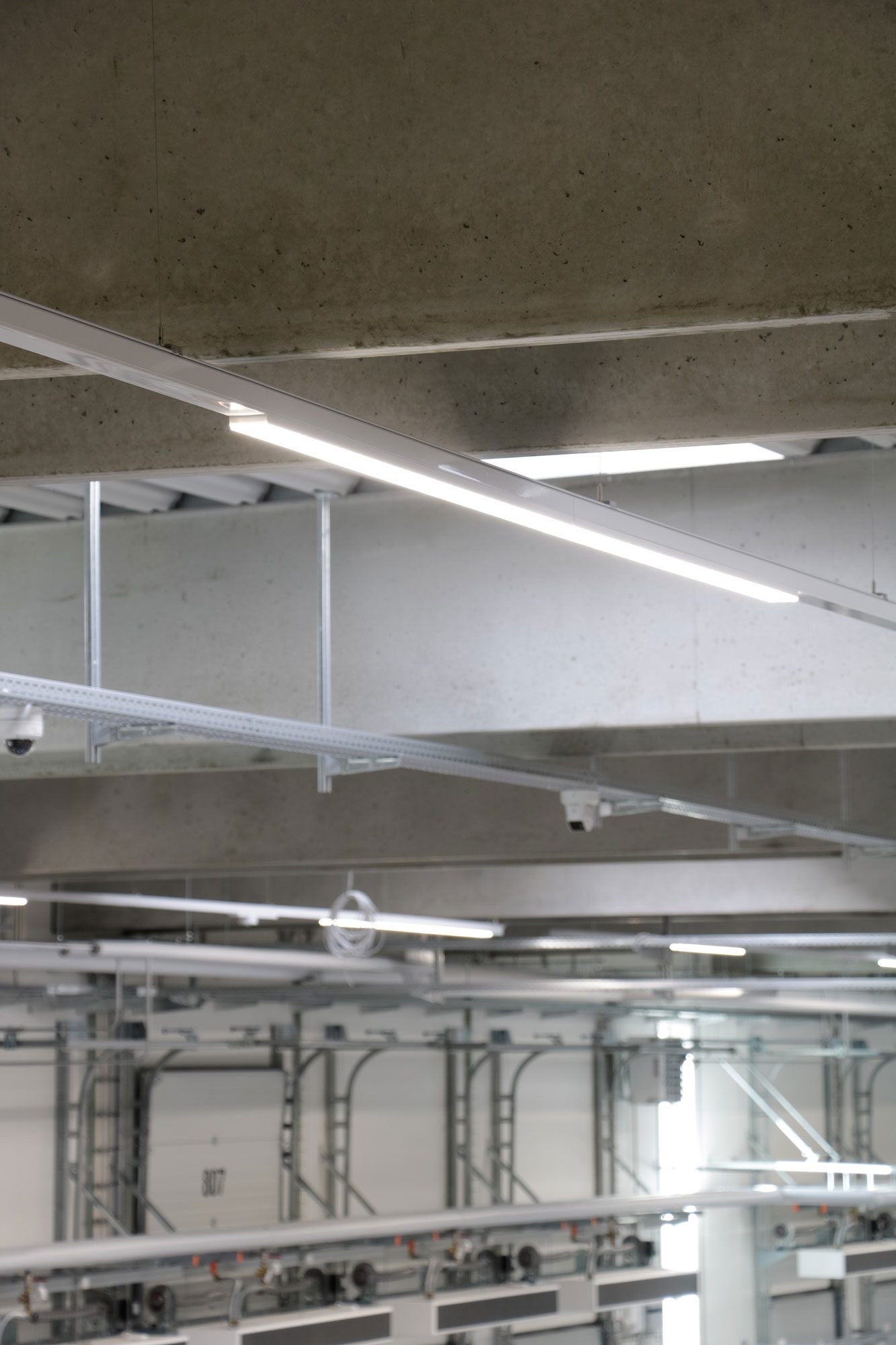 I distributionshallerne giver vores nedhængte loftsarmatur T-Trunk den helt rigtige grundbelysning. Udenfor hallen sørger udendørsarmaturet T-Floodlight at alle de udendørs arbejdsfunktioner kan foregå optimalt.