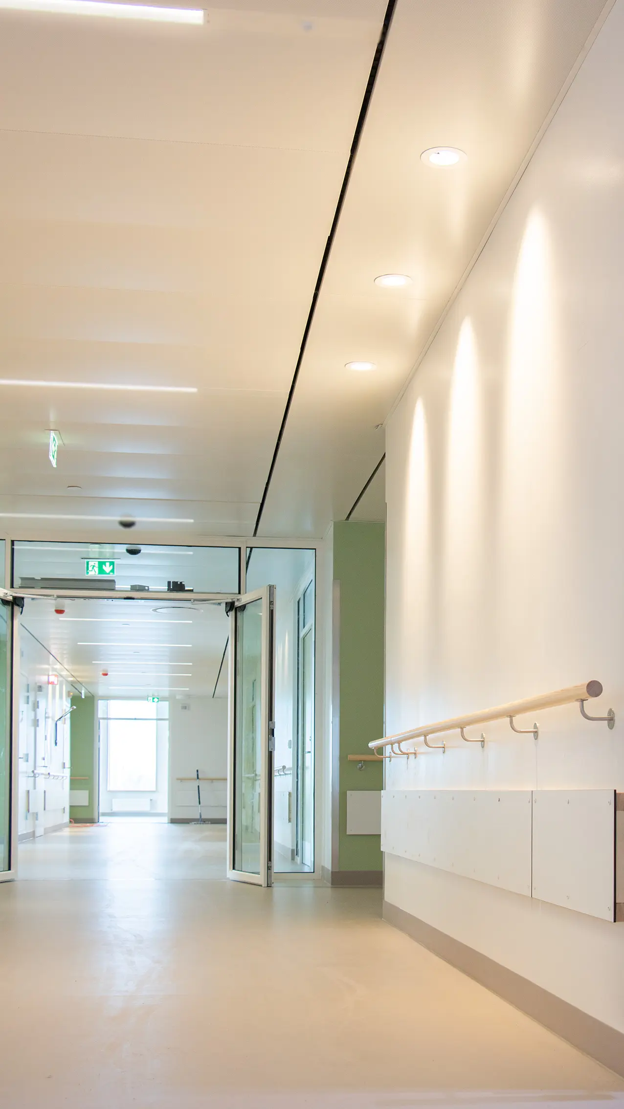 Til projektet har Teamtronic leveret belysningen til bl.a. patientstuer, hvor der er anvendt T-Hee Ø240, Ø400 og Ø500. T-Hee armaturet sikrer et afblændet lys for sengeliggende patienter, samtidig med at armaturet giver personalet på patientstuerne et effektivt lys for optimale arbejdes- og sikkerhedsforhold.