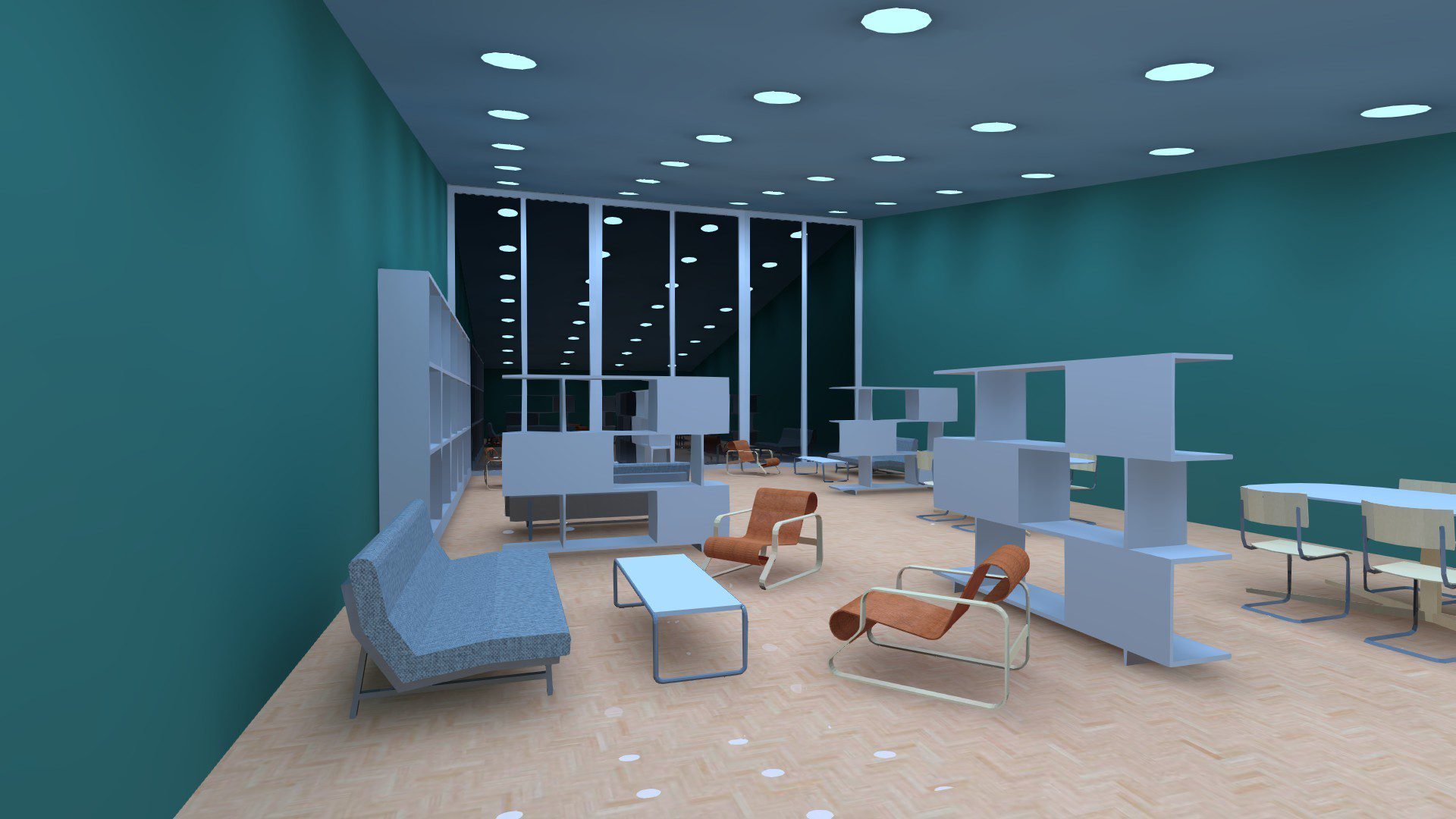 Dialux visualisering – indbygget downlight Ø500, 4000 Kelvin: De store, cirkulære downlights tilfører rummet en visuel rytme og markerer tydelige zoner med fokuseret lys. Den køligere farvetemperatur på 4000 Kelvin giver et mere klart og aktivt lysmiljø, som egner sig godt til koncentrationskrævende aktiviteter som gruppearbejde og mindre præsentationer