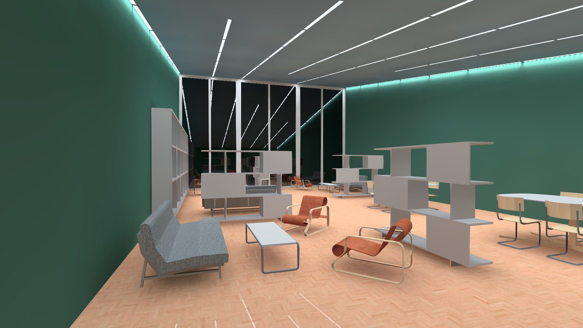 Dialux-visualisering – Linjeprofil, 3000 Kelvin: Den lineære armaturform skaber et roligt og sammenhængende lysforløb hen over rummet, som understøtter rummets arkitektur og giver en harmonisk belysningsflade. Med sin varme farvetemperatur på 3000 Kelvin bidrager løsningen til en indbydende og afslappet atmosfære – ideel til pauser, ophold og uformel snak.