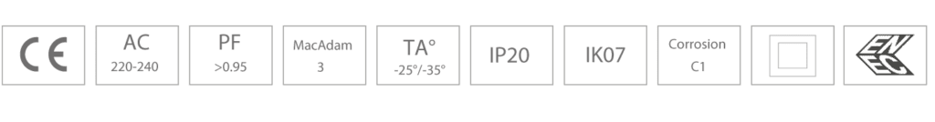 LED driver forventet levetid >50.000 timer. Armaturets certificering er under CIE EN 60598 1-2 og herunder EN550 15/EMC.