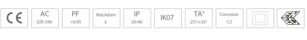 LED driver forventet levetid >100.000 timer. Armaturets certificering er under CIE EN 60598 1-2 og herunder EN550 15/EMC.